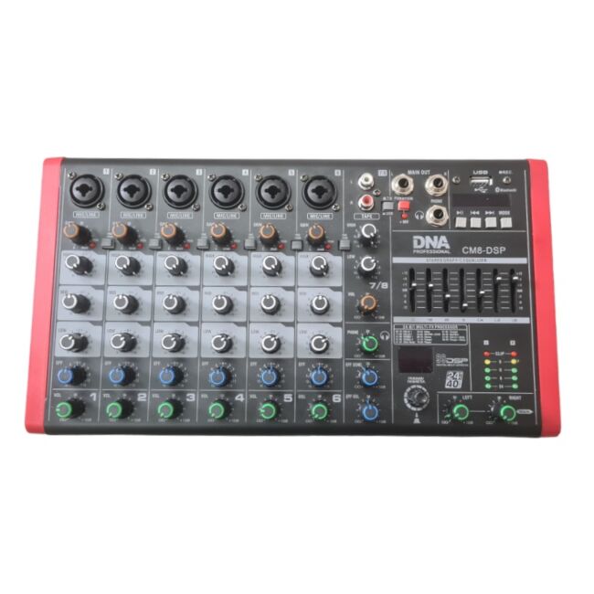 DNA CM8-DSP to kompaktowy, 8-kanałowy mikser dźwięku USB z odtwarzaczem MP3 i standardem bezprzewodowej komunikacji Bluetooth. Urządzenie wyposażone zostało w cyfrowy procesor efektów oferujący 99 różnych modulacji dźwięku, graficzny equalizer oraz zasilanie Phantom +48V, dzięki któremu możliwe jest podawanie stałego napięcia do niektórych urządzeń audio, instrumentów czy mikrofonów. To świetne rozwiązanie dla wokalistów, zespołów, mobilnych DJ-ów, a także firm eventowych oraz różnego typu instytucji.