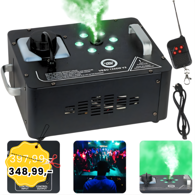 LIGHT4ME VESU 1200W V2 generator wytwornica dymu pionowego mgły DMX efekt świetlny 6x1W RGB LED pilot bezprzewodowy rączki do przenoszenia